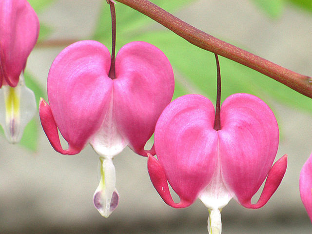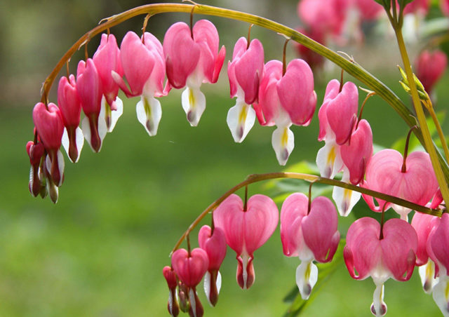 - les flors del dicèntric són de diferents tonalitats de groc, rosa-porpra o blanc pur, de fins a 2-3 cm de diàmetre, aplanades en forma de cor amb dos pètals doblegats a la part inferior i un pètal en forma de llàgrima que mira cap amunt. tub;