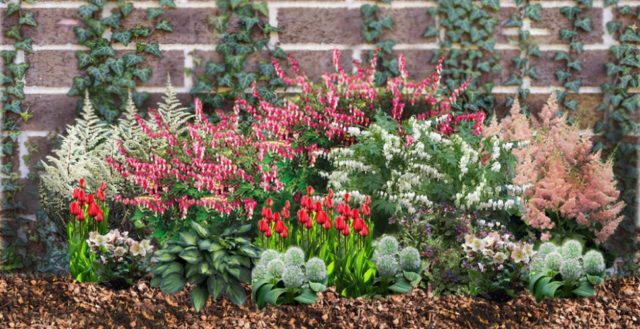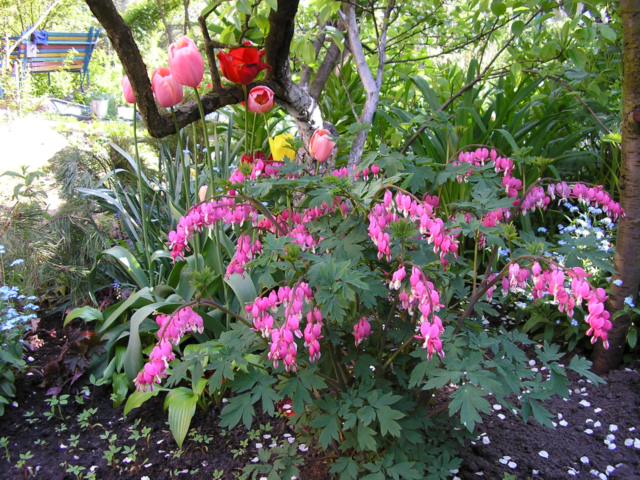 Algunes espècies poden créixer molt bé en una zona il·luminada pel sol. El dicentre del jardí, tal com es veu a la foto, s’omple d’una catifa de flors amb tulipes, narcisos, jacints, flox. Una flor amb una kupena, pulmonera, prímula, diversos tipus de falguera quedarà molt bé. Les espècies de dicentra de poc creixement, juntament amb oblits i prímules, crearan un bell llit de flors sobre el fons de runa o rajoles al llarg del camí del jardí.