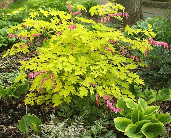 Gold Hart pertany al magnífic centre de sagnat, criat pels criadors el 2004. La varietat es distingeix per una combinació inusual d’inflorescències de color rosa brillant sobre un fons de fullatge decoratiu daurat. La dicentra és bona tant durant la floració com després, cridant l'atenció amb el color de les fulles. Un arbust alt creix fins a 80 cm.