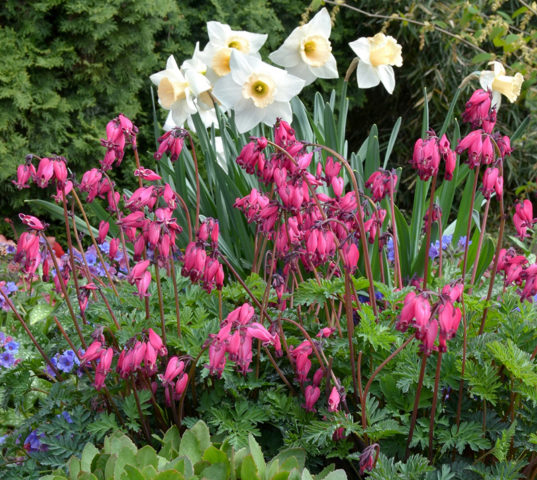 Molts jardiners van assenyalar que el dicentre és amable amb altres flors i que no està en contra del barri del parterre amb representants de diferents cultures, cosa que es veu perfectament a la foto següent. Per crear no només una composició bonica, sinó també la ubicació correcta, heu de considerar acuradament la selecció d’un lloc per a una flor exòtica.