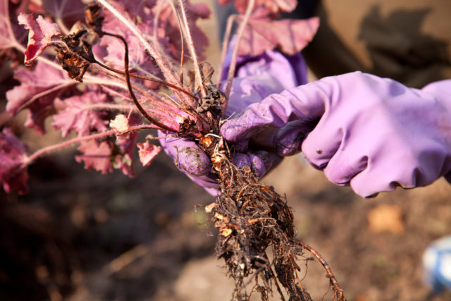 La melmelada de plantons de Heuchera es neteja de la podridura i es tallen les zones defectuoses. La molla de carbó s’utilitza com a desinfectant. Després dels esqueixos es col·loquen en un forat i s’escampen amb terra. En un mes i mig, el sistema arrel es formarà i es reforçarà completament. Si cal, la planta es pot trasplantar. Delenki amb rosetes es planten al setembre, proporcionant protecció contra temperatures extremes.