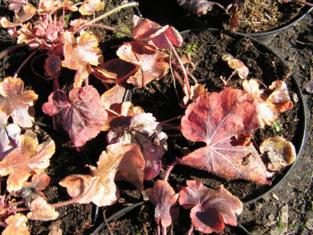 A les regions del sud amb hiverns càlids, la geychera es pot deixar sense refugi. Si el clima és dur, els brots s’aïllen amb branques de lutrasil o avet. No és necessari un refugi massa dens per a la melmelada de geyhera, ja que la planta ha de respirar. Els exemplars de contenidors es traslladen al jardí d’hivern, a la terrassa vidrada o al soterrani. A la primavera, amb l’ajut d’una podadora, es retallen amb cura tots els brots vells.