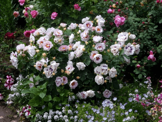 - Rose Ice for Yu decorarà perfectament el jardí i la composició. Es combina amb diferents cultures: delphiniums, peonies, asters, crisantems i altres. La condició principal és coincidir en alçada i color. Un atractiu color lila pàl·lid li permet utilitzar la rosa Ice Pho Yu per decorar qualsevol lloc del jardí. L’arbust és capaç de revifar fins i tot racons sense descriure.
