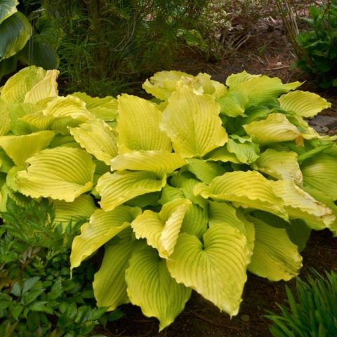 L’hosta gegant Liberty té un color full full bicolor. La part exterior és groga, daurada o cremosa, la part interior és de color verd brillant. L’arbust és notable per la seva mida sòlida, pot arribar als 1 m d’alçada i arribar a fer una circumferència d’1,7-1,8 m. Al juliol apareixen tiges de flors sobre les quals floreixen grans flors lleugeres en forma d’embut amb pètals d’espígol.