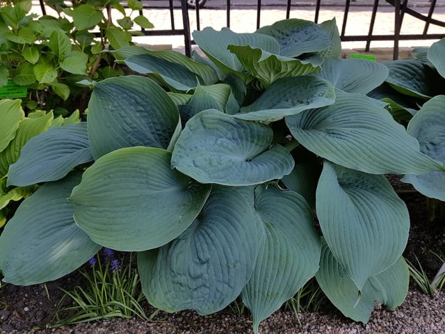 Blue Mammonth deu el seu nom a la seva gran mida i color blavós. L’arbust en forma de cúpula pot arribar a fer 0,9 m d’alçada i 1,65 m de diàmetre. Les fulles són grans, àmpliament ovades, al centre, el color té un to blau, més tard es torna de color verd brillant. La placa foliar és densa, les venes són ben visibles, creant un relleu convex. Les flors en forma d’embut, grans, quasi blanques, apareixen als peduncles al juliol.