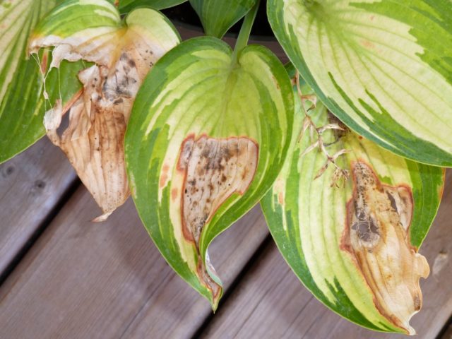 Les taques marrons a les fulles poden indicar malaltia de l'hosta amb filostictosi.