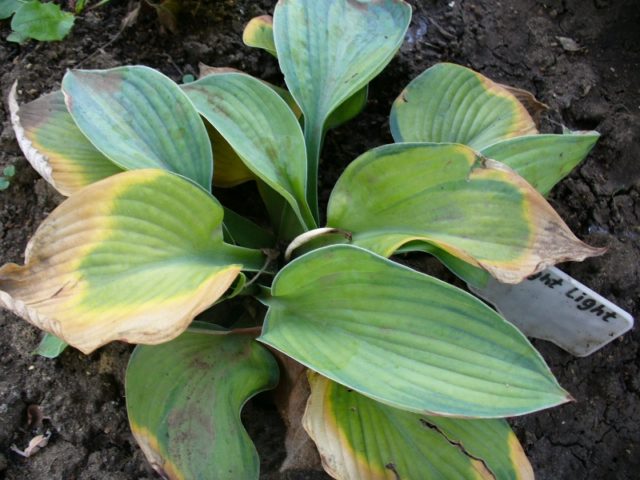 - Filostictosi, o taca marró. La malaltia es pot reconèixer per les taques marrons-marrons de les fulles. Les parts infectades de la planta s’han de tallar i cremar i els propis hostes han de ser tractats amb preparats Abiga-Peak o Strobi. En cas de danys greus, és necessari desenterrar i destruir tota la planta en conjunt. Atès que l’agent causant del fong viu al sòl, s’ha de desinfectar el sòl amb formalina.