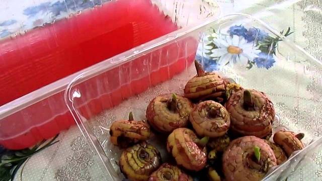 Els nens han de ser esbandits, assecats i classificats en graus. Les caselles es poden marcar amb etiquetes. A l’hivern, els bulbs s’han de revisar de tant en tant per comprovar si tenen malalties. Si es troba floridura als tubercles, és important ventilar immediatament l’habitació, reduint així la humitat de l’aire. I el material de plantació s’ha d’escampar amb un material hidrofòbic.