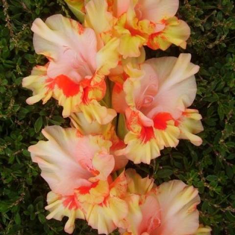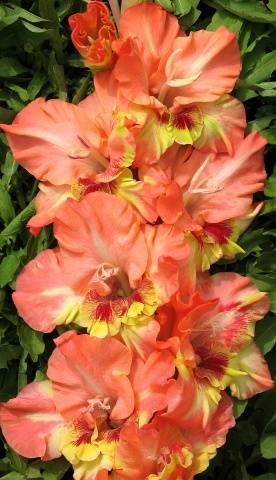 Un dels gladiols més bells, on les taques radiants de color vermell-rosa brillen sobre un fons groc brillant. La inflorescència és molt densa i potent.