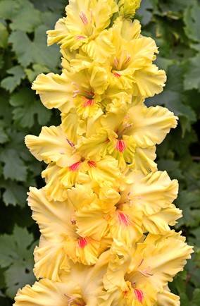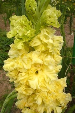 Aquest gladiol té un color groc ric molt bonic amb un traç carmesí al centre. Una característica de la varietat és que el seu nadó floreix l’any de plantació.