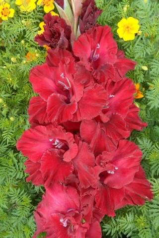 Les flors carmesí brillants, que simbolitzen l’energia, el poder i els sentiments forts, són el millor encaix per a empresaris i dones en professions creatives. Són bons per contrastar rams amb gladiols blancs com la neu.