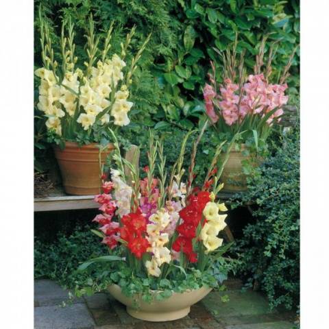 Els criadors russos han creat mini-varietats, l'alçada de les quals varia entre 30-50 cm. Les flors també són més petites de l'habitual, però el color d'aquestes plantes regals és molt divers. Els gladiols cultivats en test no són en cap cas inferiors als plantats a terra. Es pot veure per si mateix mirant la foto.