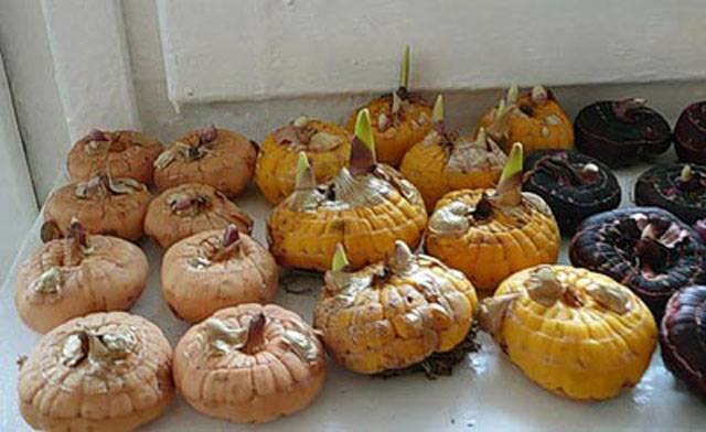 Després d’això, les bombetes s’han de col·locar sobre un davall de sol per tal que les escates s’assequin. Quan es rovellen a les mans, es retira el material de plantació per guardar-lo. Alguns cultivadors els guarden en recipients a la nevera.