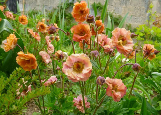 El cultivar gravilata està representat per flors taronges, vermelles, roses i grogues, de forma semi-doble
