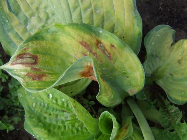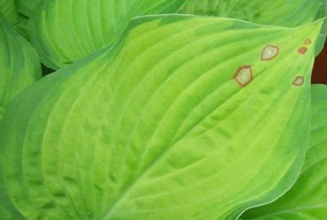 - Filostictosi... Apareix en amfitrions debilitats després de l'hivern. Símptomes: apareixen taques marrons amb una floració gris a les fulles.