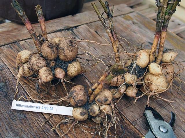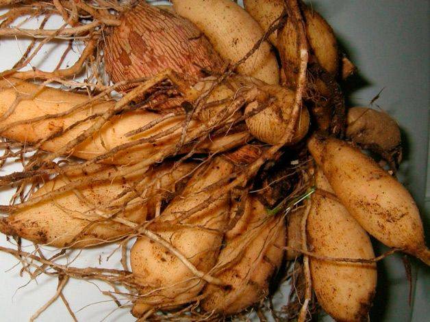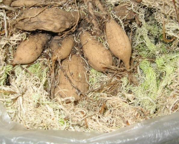 Després, els tubercles s’escampen amb serradures o es plegen a bosses de plàstic i s’envien al soterrani. A la primavera, quan cal plantar dalies, haureu de treure l’escorça dels tubercles, fregant-la fins que s’esquerdi.