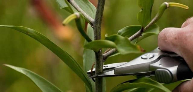 Podar els lliris després de la floració és un pas essencial en la cura de les flors. Tot i que les fulles són verdes, nodreixen el bulb, enfortint-lo i aportant-hi els elements necessaris. Quan es poda, els talls es fan oblics de manera que l’aigua de pluja no s’acumuli, sinó que flueix per la tija. Els talls rectes poden provocar la decadència dels peduncles. A una alçada de 15-20 cm, les tiges es deixen fins a la tardor.