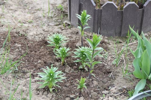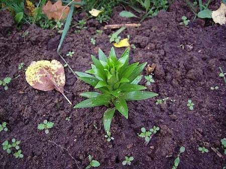 Els bulbs de lliri germinats es planten abans de mitjans de finals de maig. Quan prepareu els forats de plantació, tingueu en compte la mida dels brots. En cap cas, els brots joves no s’han d’enterrar a terra, en cas contrari simplement es podriran.