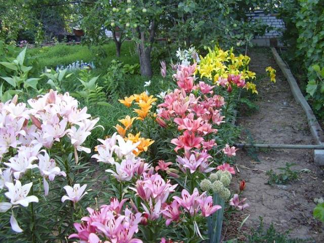 També podeu plantar diverses varietats de lliris una al costat de l’altra. A l’hora de plantar, és important tenir en compte la varietat, l’alçada de la planta i el moment de la seva floració. Podeu planificar i plantar flors de manera que floreixin una rere l’altra, decorant la parcel·la del jardí durant molt de temps.