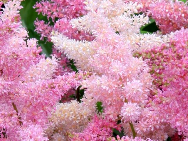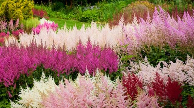 La gamma de colors de colors astilba es presenta en una gran varietat de tons: blanc com la neu, rosa, porpra, lila pàl·lid, vermell brillant, carmesí i fins i tot violeta.