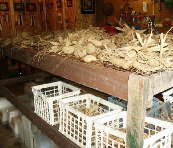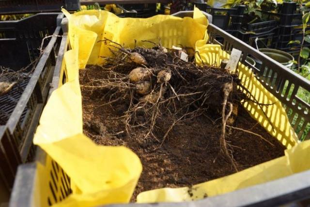 Emmagatzematge dàlies després de cavar no és un problema si la preparació dels tubercles s’ha dut a terme correctament. Les arrels seques, desinfectades amb un agent antisèptic, s’emmagatzemen bé en condicions de baixa temperatura i humitat. Les fluctuacions de temperatura poden provocar una germinació prematura dels cabdells, cosa que provocarà la mort o el deteriorament de la qualitat del material de plantació. També és important recordar que només es poden emmagatzemar tubercles madurs per guardar-los. Si desentereu les arrels abans de l’arribada de les gelades, la seva qualitat de conservació serà baixa.