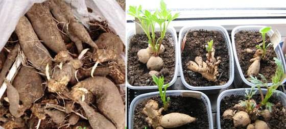 Durant l’emmagatzematge, podeu comprovar periòdicament l’estat de les arrels. En aquest cas, la sorra no s’ha d’humitejar en cap cas, ja que això pot provocar la decadència de les arrels. La particularitat d’aquest mètode d’emmagatzematge és el primer despertar dels tubercles. Per evitar una germinació prematura, cal reduir estrictament la temperatura d’emmagatzematge a +30DE.