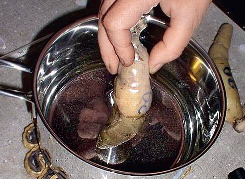 - Cal submergir les arrels en parafina durant només uns segons. Traient-los del contenidor, es pot veure una pel·lícula de parafina que protegirà els tubercles de factors externs durant l’emmagatzematge a l’hivern.