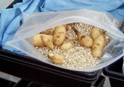 Els tubercles en parafina es poden col·locar en caixes, galledes o bosses, embolicats amb paper d'alumini. La particularitat d’aquest mètode d’emmagatzematge és la germinació prematura dels tubercles. Per tant, es recomana utilitzar el mètode per a varietats primerenques.