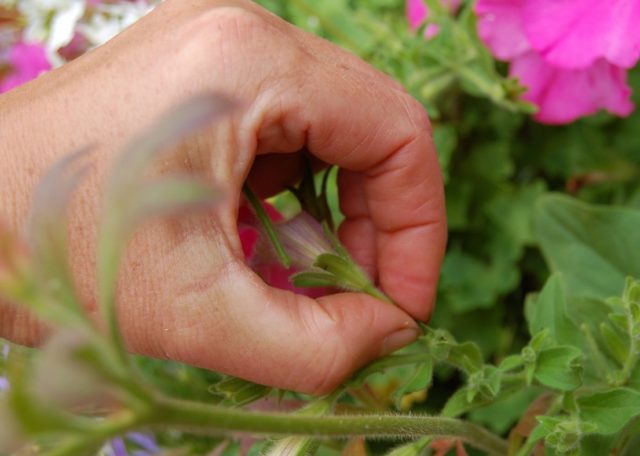 - Eliminació de les gemmes marcides. Perquè la petúnia floreixi abundantment, haureu de recollir regularment les flors que s’han marcit. Si els deixeu formar beines de llavors, les forces de la planta no es dirigiran a la floració, sinó al desenvolupament de les llavors.