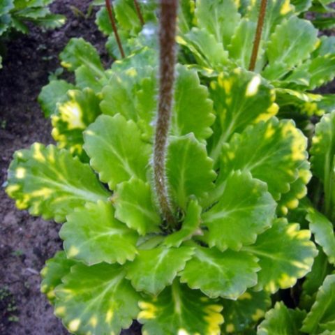 Les fulles de la saxifràgia són ombres ovalades, petites, denses. Les plaques són de color verd fosc, fins a 5 cm de llargada, es concentren a la base de la planta i formen una roseta basal. Les vores de les fulles són desiguals i hi ha ratlles morades a la part posterior.