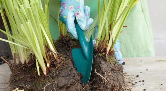 - El rizoma de l’iris siberià s’extreu acuradament del terra.