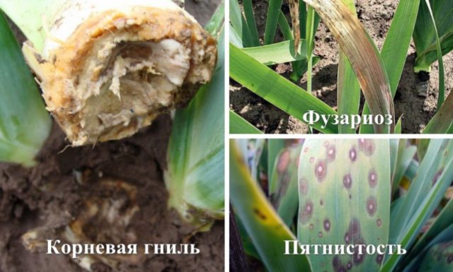 La part de l’arrel també es pot veure afectada per fongs o virus (podridura de l’arrel, bacteriosi, fusarium). Amb una forta derrota, els iris siberians són excavats i destruïts. Si els símptomes es van detectar en les primeres etapes, s’utilitzen diversos mitjans: permanganat de potassi, sulfat de coure, remeis populars, fungicides.