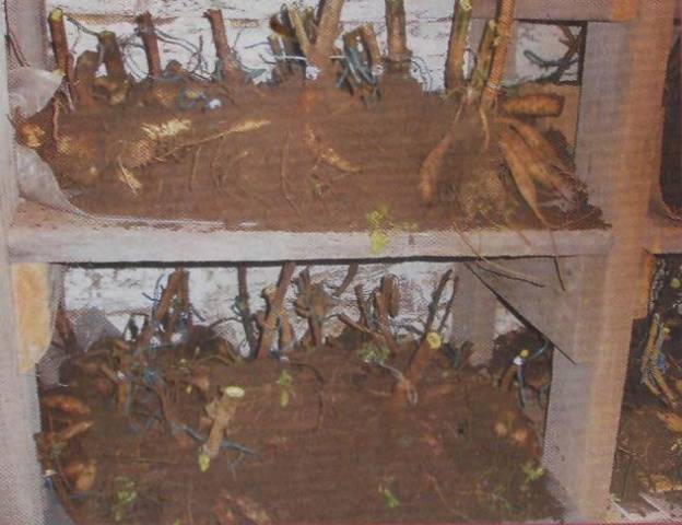Els tubercles Dahlia s’emmagatzemen en una habitació fresca i sense accés a la llum solar. En una casa de camp privada, pot ser un celler o soterrani, un passadís fred. La temperatura d’emmagatzematge ha de ser de + 4 ... + 60C. A temperatures elevades de l’aire, els tubercles de dàlia comencen a brotar, les baixes temperatures condueixen a la seva congelació. Ajustant la temperatura a l’habitació, podeu influir en els cicles de vida de la planta: si a principis de primavera comença a germinar el brot de renovació de les dàlies, és necessari reduir la temperatura a +30C. Si és necessari despertar artificialment les plàntules per al cultiu primerenc, la temperatura s'ha d'elevar a + 8 ... + 100DE.