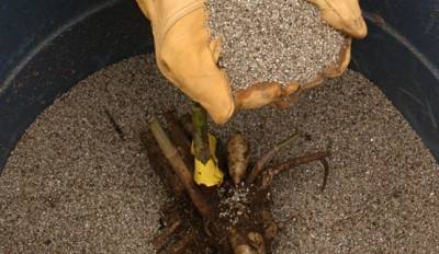 - La vermiculita té excel·lents propietats d’aïllament tèrmic i un baix nivell d’higroscopicitat. Protegeix els tubercles de dàlia de les fluctuacions de temperatura i humitat, prevé la germinació prematura de les arrels. La vermiculita s’aboca en un recipient on els tubercles de dàlia es col·loquen posteriorment en capes. També s’aboca una capa de material de gra fi sobre les arrels.