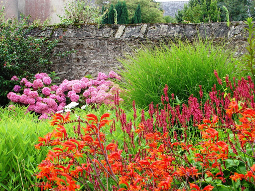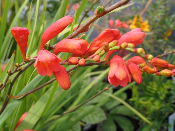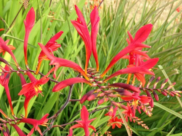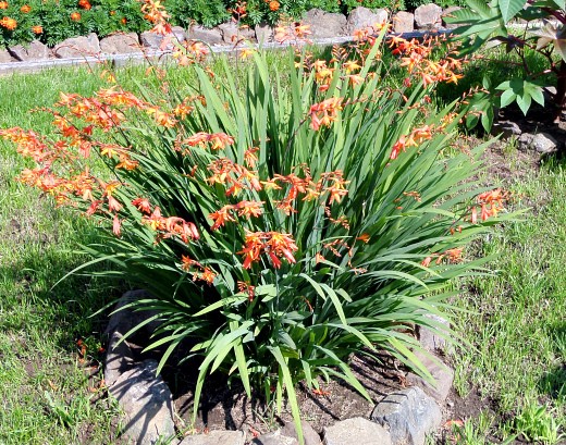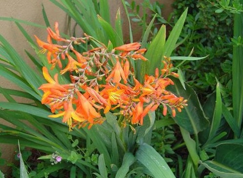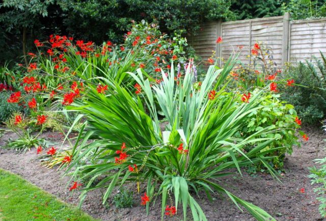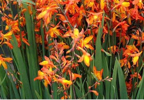 Les flors brillants de Crocosmia vulgaris són visibles des de qualsevol lloc del jardí