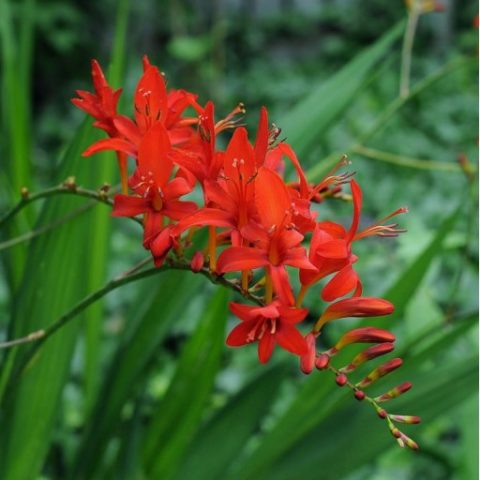 Les flors de la perenne crocosmia Red King són de color molt brillant, de manera que aquesta varietat es planta al centre del jardí.