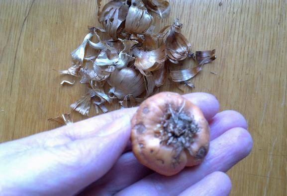 En primer lloc, les escates que el cobreixen s’eliminen de cada bulb. Això és necessari perquè les fletxes creixin lliurement. Cal netejar-lo amb cura. En netejar el tap al lloc on apareix el brot, cal actuar amb molta cura per no danyar el brot.