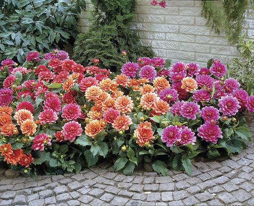 Ara és molt popular plantar varietats de dalies de baix creixement en contenidors. Els habitants de les ciutats que conreen flors als balcons i les galeries també poden cultivar-les. Una cosa que cal recordar és que els tests només són adequats per a les dàlies cultivades amb llavors. A la primavera també es pot plantar una tija d’una varietat de poc creixement en un test, però el seu volum no ha de ser inferior a 5 litres.