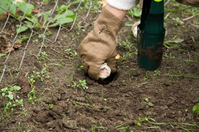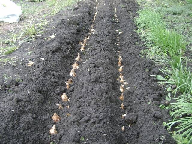 Es recomana abocar un grapat de sorra mullada a cada forat abans de plantar-lo.Les bombetes s’insereixen amb cura, no es premen a terra, per no danyar el fons. Des de dalt, el forat es cobreix amb terra solta o torba.