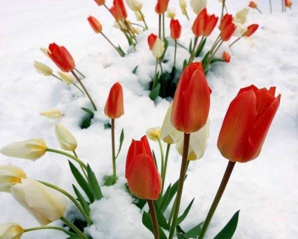 És important fer un seguiment de la quantitat de precipitacions a l'hivern. Si Zimushka és generós amb nevades, no cal fer cap acció per preservar els bulbs. Però si al contrari, al lloc on es planten les tulipes, és necessari llençar manualment tanta neu com sigui possible, cobrint els futurs parterres amb una manta blanca com la neu.