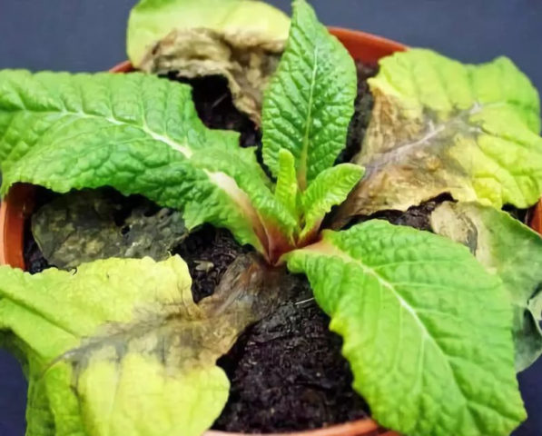 La prímula interior no tolera la humitat estancada del sòl i l’assecat de les arrels. Però amb una sequera a curt termini, la situació es pot corregir, fins i tot si les fulles de la planta han perdut la turgència. Per fer-ho, cal saturar el terròs durant 15 minuts. i reordenar la planta a ombra parcial. Quan es restauren les fulles, la flor es pot tornar al lloc original.