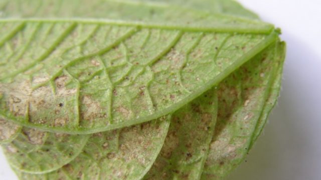 - Àcar. Aquesta plaga no supera els 0,2 mm de longitud, per la qual cosa és difícil veure-la a simple vista. Es pot reconèixer una lesió per petits punts grocs al llarg de la vora de la placa foliar. L’aire sec i la temperatura ambient alta són factors provocadors. Per a la destrucció, es recomana processar la flor dues vegades amb una freqüència de 7 dies. Drogues efectives: Actellik, Fufanon, Fitoverm.