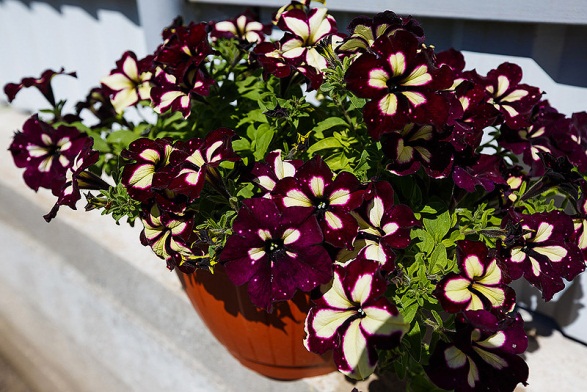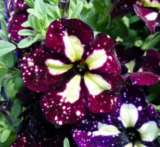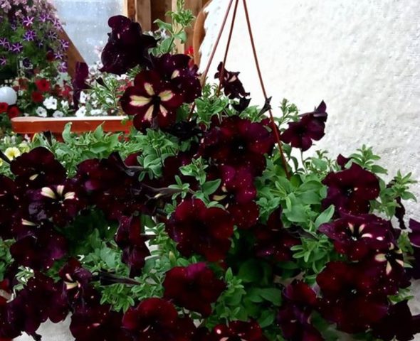 Les varietats Thunderous i Night Sky estan perfectament combinades. Diversos tipus de petúnies tacades es planten en tests penjats.