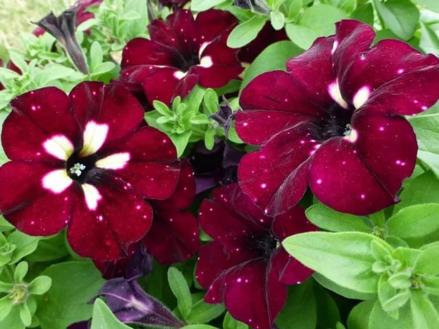 Els cabdells són de color bordeus fosc, cirera, carmesí, amb petites taques blanques, en forma de bol, el seu diàmetre pot arribar als 8-10 cm. Els pètals són rodons, amples, n’hi ha 5 a la branca, apareixen punts blancs a les flors quan hi ha una gran diferència de temperatures nocturnes i diürnes. Si feu créixer una petúnia vegetativa Cel tempestuós a la llum directa del sol, apareixen més taques de color crema, es fonen, els rovells es tornen gairebé beixos, amb una vora fosca al voltant de la vora.