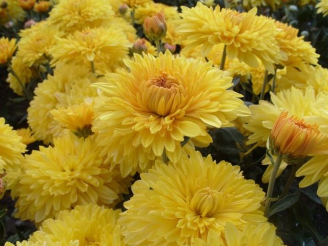 Un crisantem de mida mitjana anomenat Zolotaja Osen dóna brots dobles aplanats de color groc. Els pètals són més clars a les puntes que al nucli. Adquireix una plena decorativitat des de principis de setembre, pot suportar amb calma els freds fins a -30 ° C sense refugi especial.