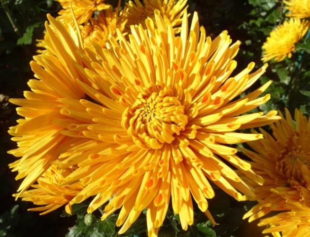 Una gran varietat anomenada Natasha produeix grans i assolellats cabdells grocs a finals de setembre. Les flors del crisantem són radials, amb fines agulles i pètals llargs. L'alçada de la mata decorativa s'eleva fins a 1 m.