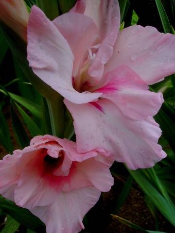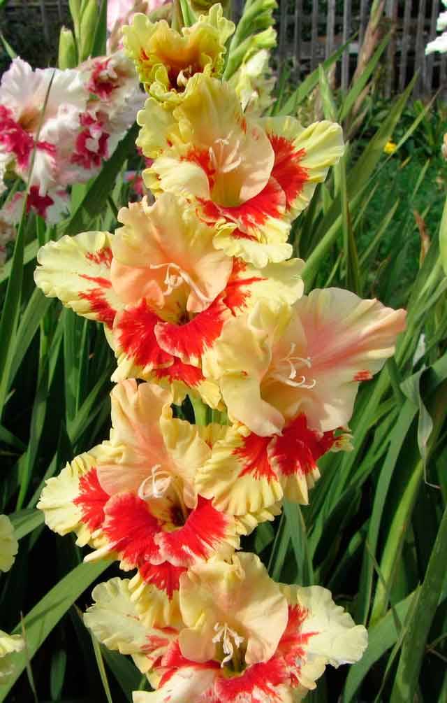 - Els gladiols de tonalitats brillants i contrastades tenen un aspecte preciós al costat. Una altra tècnica avantatjosa és plantar juntes flors del mateix color pastel.