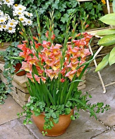 - És bastant difícil formar parterres de flors amb gladiols; aquestes flors altes estan fora de l’estil general. Els dissenyadors de paisatges experimentats recomanen combinar-los amb primeres tulipes, narcisos i arbres, a més de complementar-los amb hortènsies tardanes, cosa que permetrà obtenir un llit de flors que continuï florint de maig a octubre.