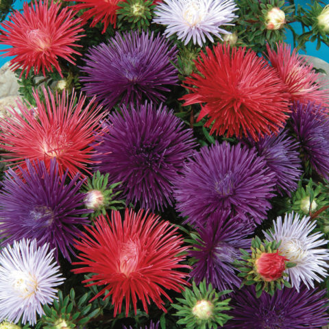 Les inflorescències dels asters de canya anuals "Ploma d'estruç" poden arribar als 13 cm de diàmetre