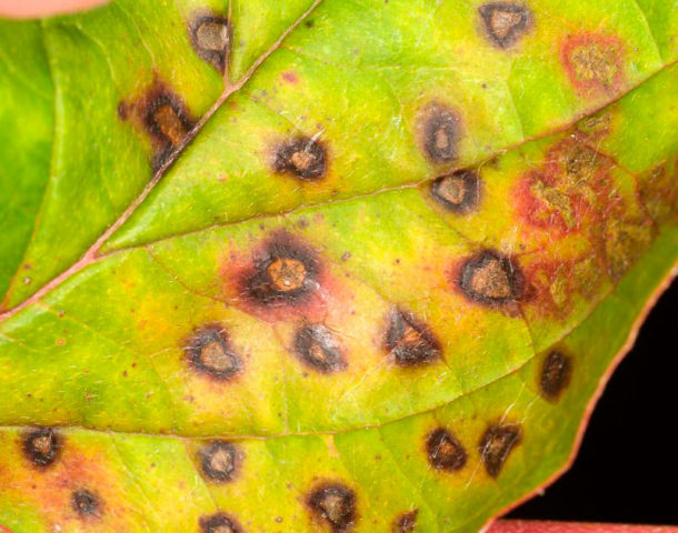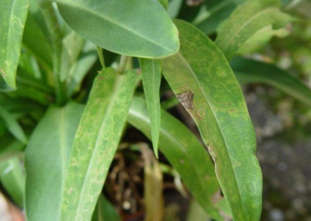 - Taca bacteriana es manifesta en taques marrons i grogues, de fins a 2 cm de mida a les fulles. Quan es detecten els primers signes d’una malaltia per a les plantes, s’ha de proporcionar un hàbitat sec, el sòl s’ha de tractar amb una solució de permanganat de potassi a l’1%, sulfat de coure.